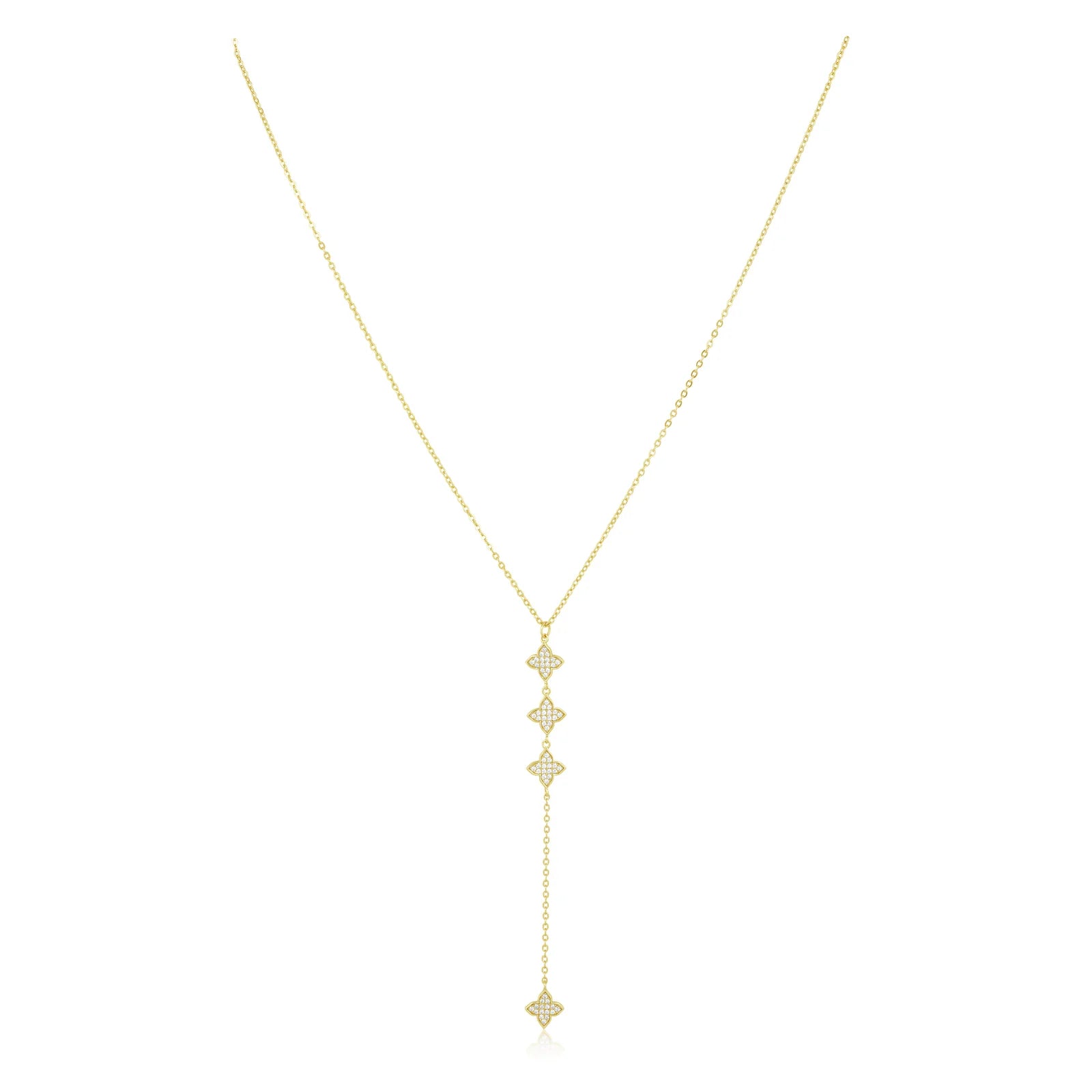 Experience the sweet sophistication of our Amanda CZ Lariat necklace, adorned with sparkling pave stones. Perfect for adding a touch of elegance to any outfit.