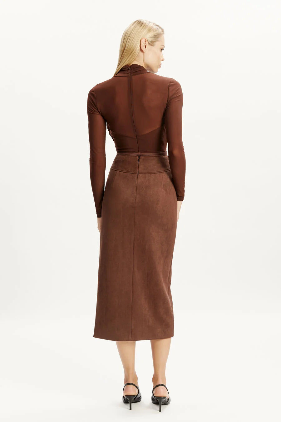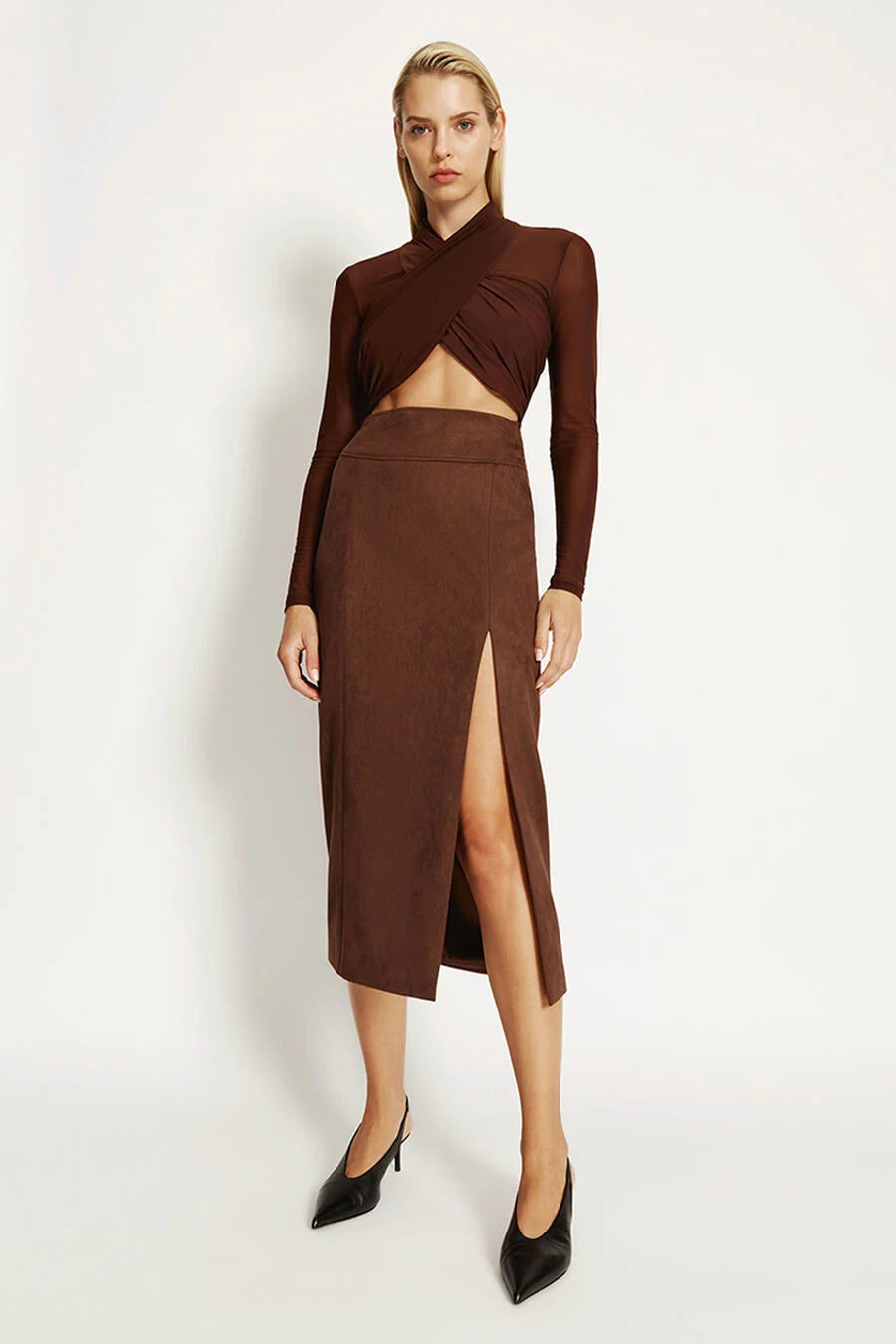 The Aliyah Wrap Bodysuit in chocolate, hugs the upper bodice and wraps around all the right places. Featuring discreet paneling from bands of mesh and stretch material, it is finished with a high-rise cut and snap crotch, and shaped with a classic round neckline.