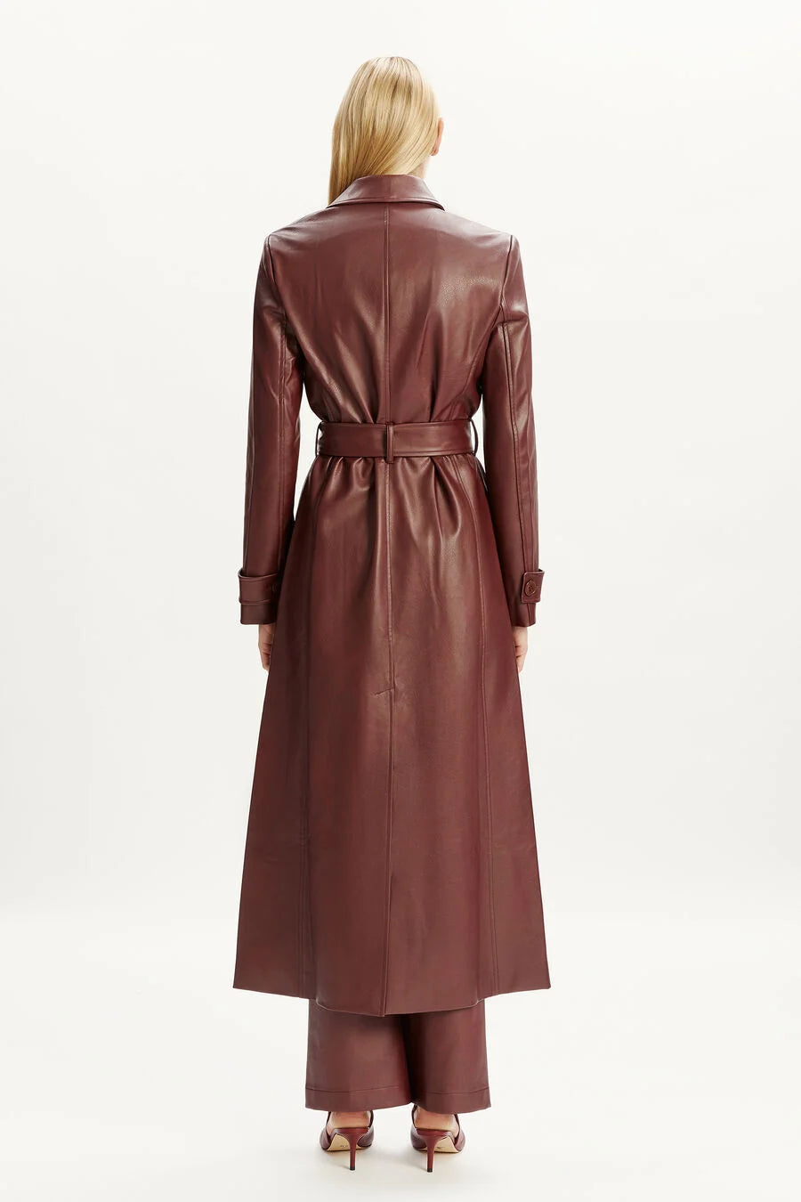 Always classic. The Vegan Leather Longline Coat is a considered piece that. Imagined in a rich deep burgundy, the fabric is a buttery soft vegan leather, that hugs all curves effortlessly. Classic details like a double breast, self-waist belt and tabs on the sleeves, make this the easiest throw on jacket over everything.