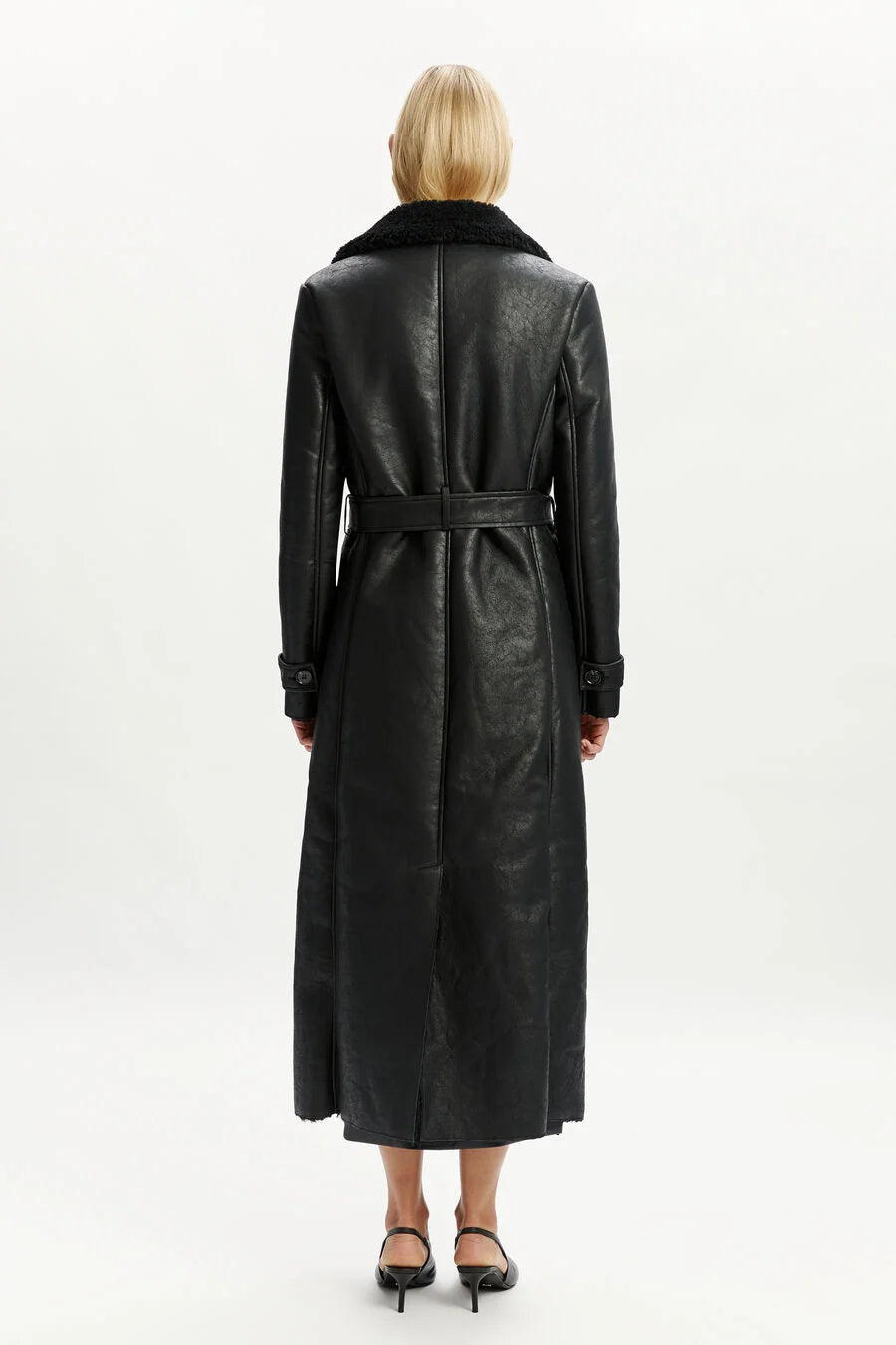 Decadent outerwear. The Vegan Leather Shearling Coat in black is reimagined with a plush shearling lapel and lining, adding warmth and sensory to a classic silhouette. Featuring a double-breasted front, self-tie waist belt, and buttoned sleeve tabs, it’s finished with a back vent for ease of movement and an unlined construction for a fluid silhouette.