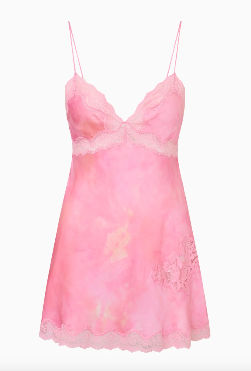 Introducing the Nivola Dress. This gorgeous slip dress stuns with a solid charmeuse silk blend fabric with a hand-dyed-like print all over. The mini dress features vintage-inspired laces at the neckline and hem adorned with shell-and-pearl embellishments. The piece begins with thin spaghetti straps above a v-neckline that falls to a flattering A-line skirt.