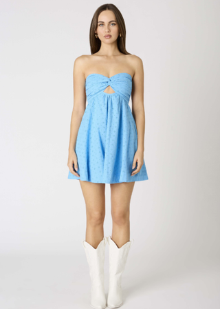 Meet our Gustavia Strapless Mini Dress with blue eyelet print, keyhole detail and a twist knot front. Features side pockets and double elastic back straps!