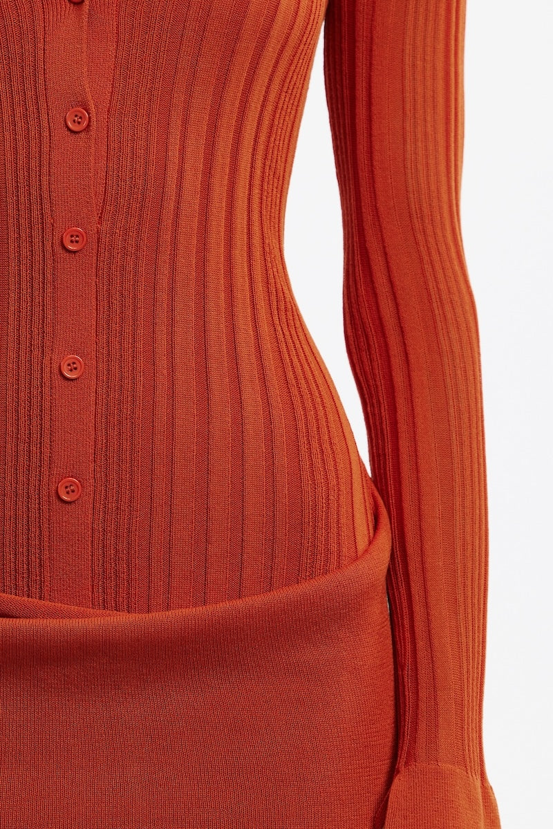 Made for sunny weekends and nights out, the Yasmine Mini Dress in Persimmon combines comfort with style. The rib knit top hugs the body with a plunging neckline and functional button detailing, while the jersey skirt features a draped waist overlay for added shape. Pair with a boot or chunky sandal for perfect summer styling.