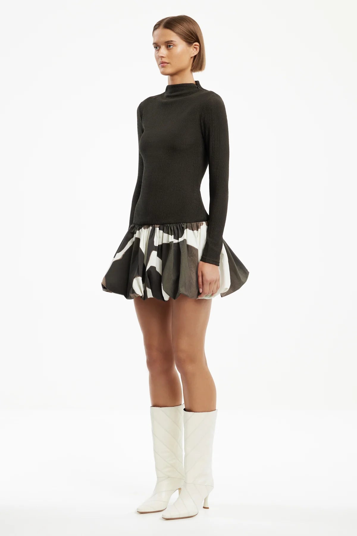The Charley Mini Dress in Espresso Orchid blends texture and volume in a fresh, event-ready silhouette. Featuring a ribbed jersey bodice and long sleeves with a cotton bubble skirt, it's finished with a placement print and an invisible zip at the shoulder. Fully lined through the body for a comfortable fit.