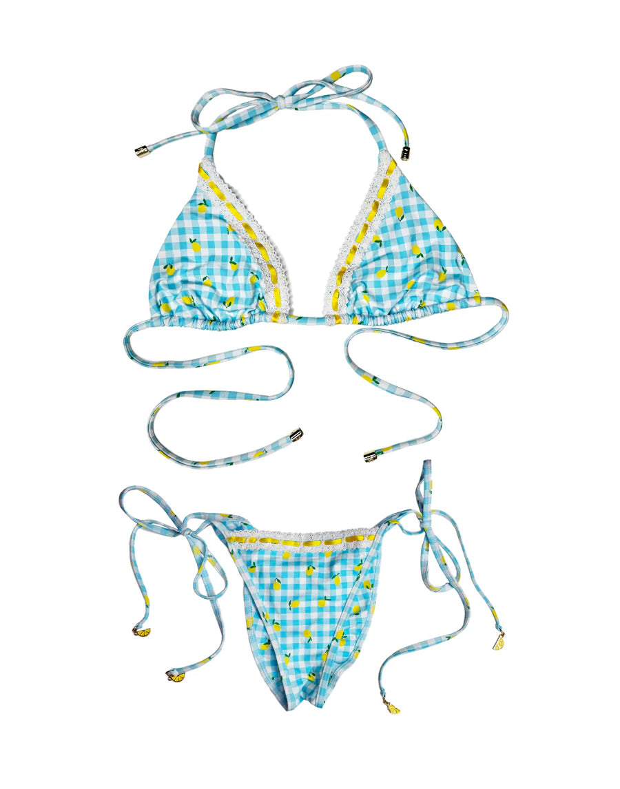 Bring the sunshine wherever you go with the Limoncello Spritz Triangle Top by Beach Bunny Swimwear. This flirty triangle bikini top features a playful blue gingham print with sweet yellow lemon embroidery, finished with delicate lace trim for that extra touch of feminine charm. Adjustable neck and back ties ensure the perfect fit, while soft cups offer comfort and a natural lift. Perfect for poolside lounging, beach days, or tropical getaways, this standout top pairs flawlessly with any of the Limoncello Spritz bottoms for a fresh, fun summer vibe.
