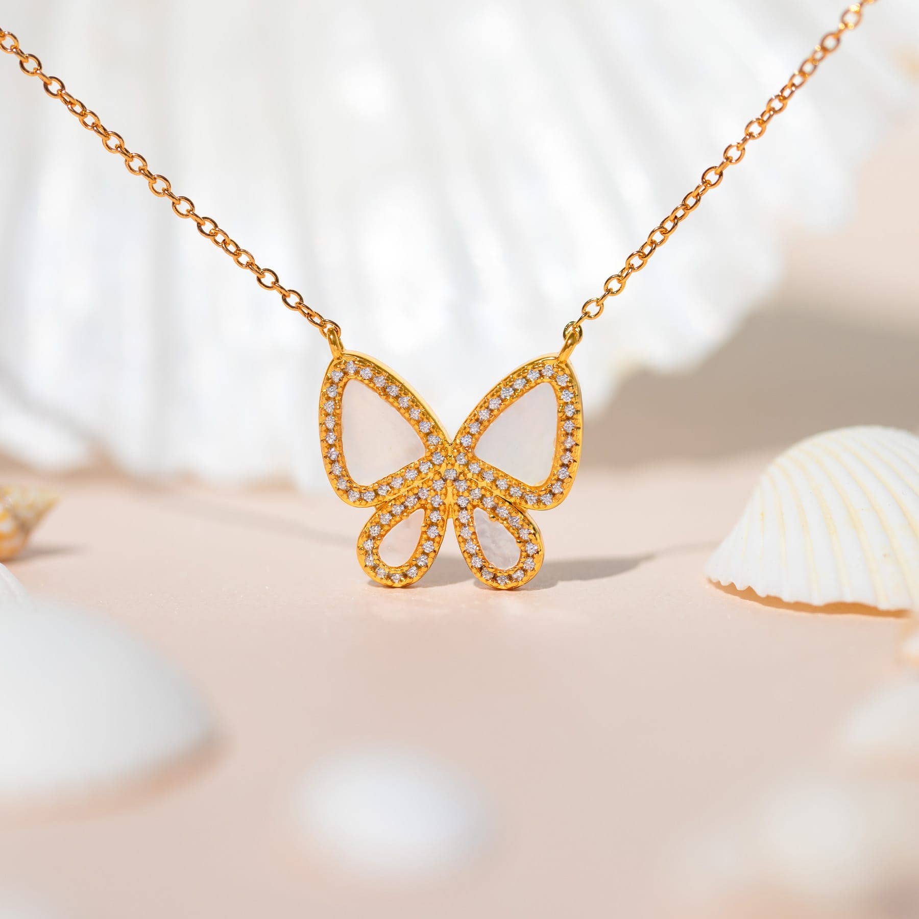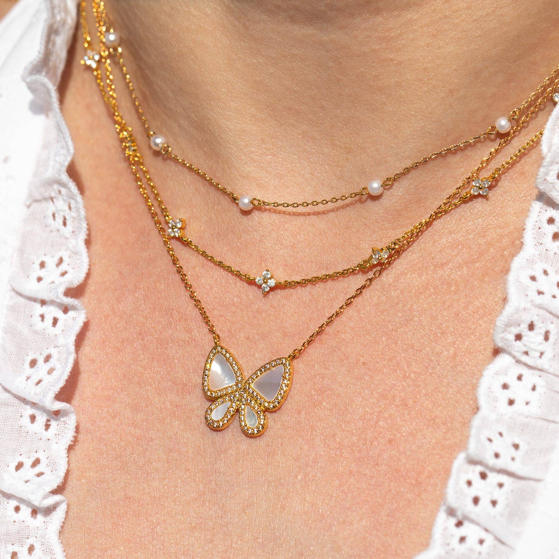 Get ready to flutter into paradise with the Mother of Pearl Butterfly Necklace! Featuring a mother of pearl butterfly charm, this necklace adds a touch of light and fun to any outfit. From beach days to daydreams of tropical escapes, this butterfly brings all the good vibes and a bit of sparkle.