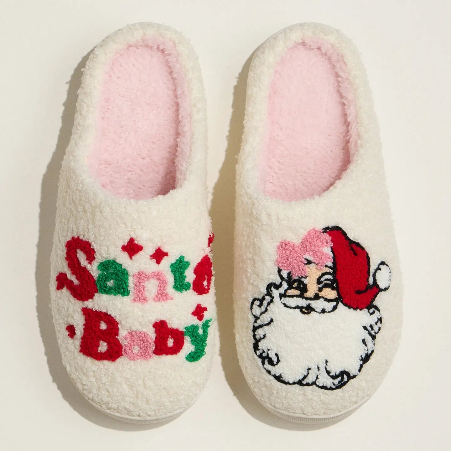 Get cozy and festive with these Santa Baby Holiday Slippers. Made from ultra-soft polyester with a plush pink lining, these comfy slip-on slippers feature a fun embroidered design — one slipper says "Santa Baby" in playful pink, red, and green lettering, while the other showcases a cheerful Santa with a pink bow. The perfect blend of holiday cheer and cozy comfort, ideal for lounging or gifting.