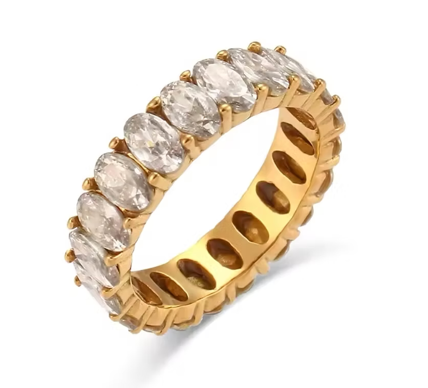 A beautiful piece of bling! The oval solitaire is a full band of Cubic Zirconia crystals on a gold plated stainless shell base!