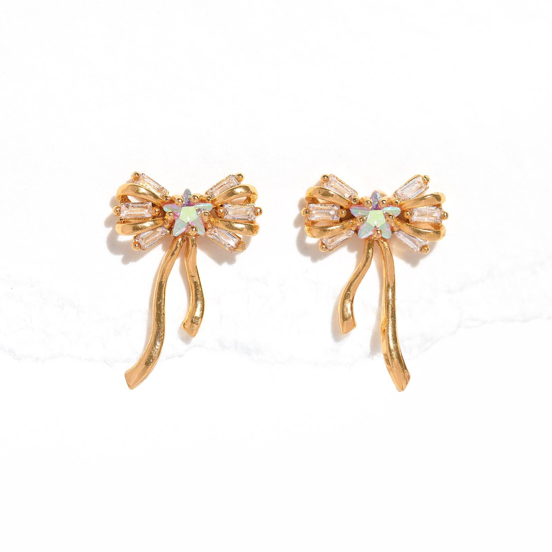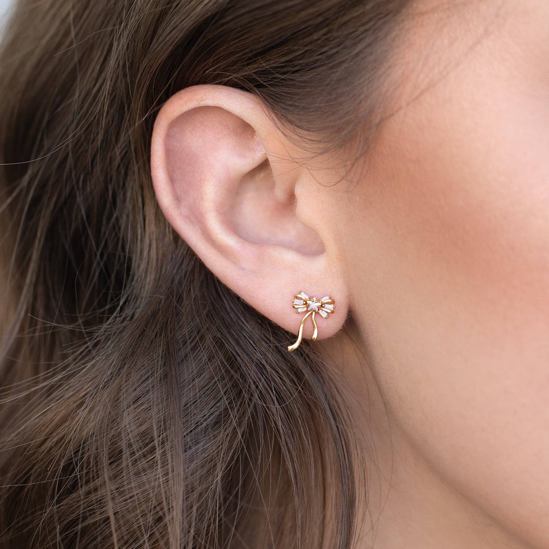 Crafted with meticulous detail, the Coquette Bow Earrings bring a refined and feminine touch to any ensemble. A perfect blend of grace and style, these earrings capture the essence of effortless beauty. * 18k gold plated * Cubic zirconia stones * Sterling silver posts with butterfly backings *