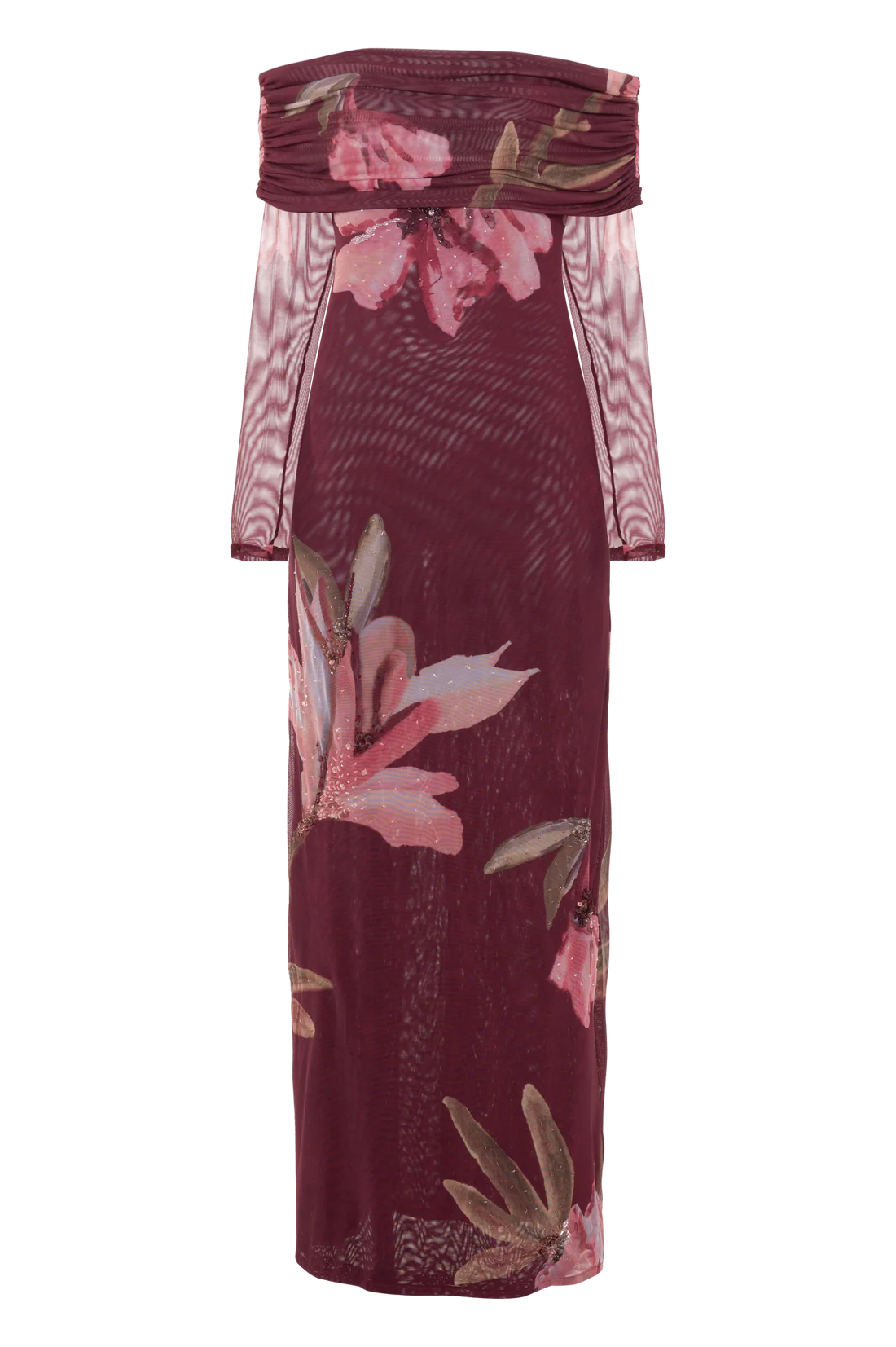 The Delicata Tulle Maxi Dress is an off-the-shoulder beauty featuring the Delicata motif. Dramatic yet effortlessly chic, this piece hugs the body in all the right places, creating a stunning silhouette. The back slit adds a touch of allure, making it perfect for both everyday elegance and special moments.