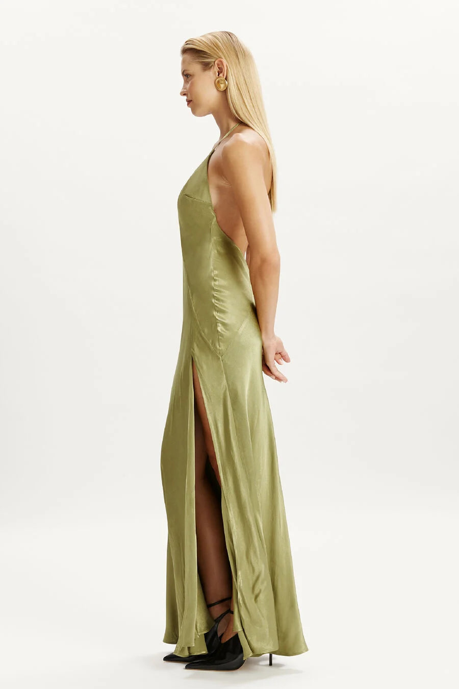 Eventwear is enlivened by the Yve Halter Dress. Featuring an elongating silk-like design with a maxi-length silhouette, plunging halter-neck, front slit and open back. Destined to leave an enduring impression, finish with a heel in a soft neutral hue.
