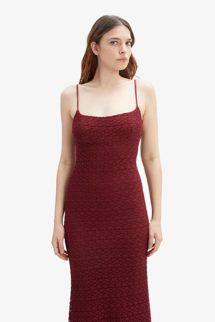 Rich like Merlot. The Louisa Mesh Midi Dress is a sleeveless midi dress crafted from stretch mesh fabric and features a floral pattern, set atop a rich burgundy backdrop colour. Featuring a scoop neck and a fitted silhouette, this elegant midi dress is perfect for all occasions, dressed up or down.