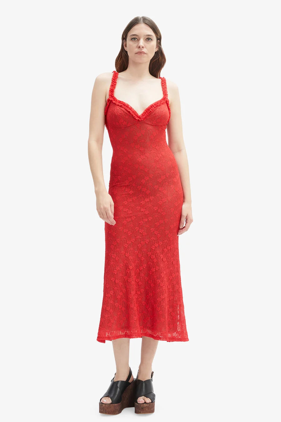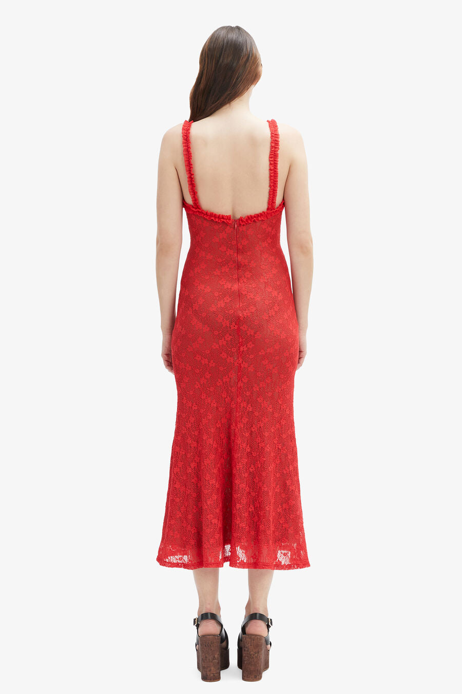 - Stretch lace midi - Fill details along neckline and straps - Fitted through body - Sweetheart neckline - Kick out at hem - Fully lined in tan mesh - Invisible zipper