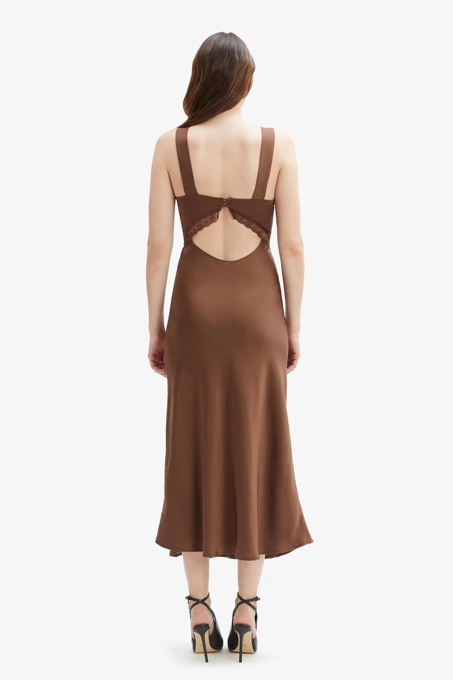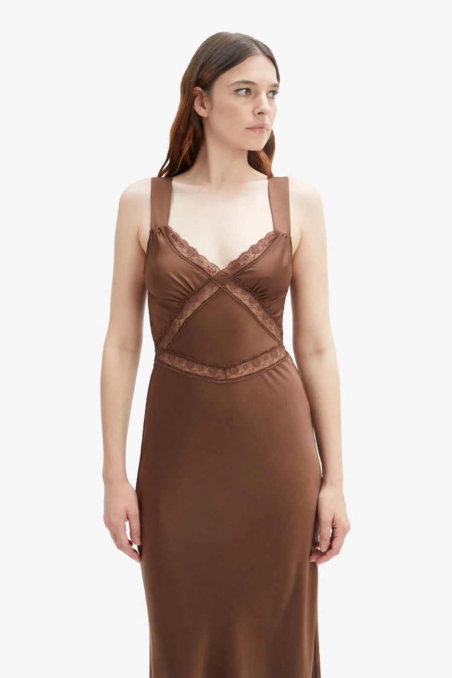 Gourmand dressing. The Emory Lace Slip Dress has a sensual lingerie-inspired silhouette that creates a fun and flirtatious style. A dramatic cutout at the back is balanced with a statement diamond panel at the front that is trimmed with lace for a luxe finish. Ideal for any event.