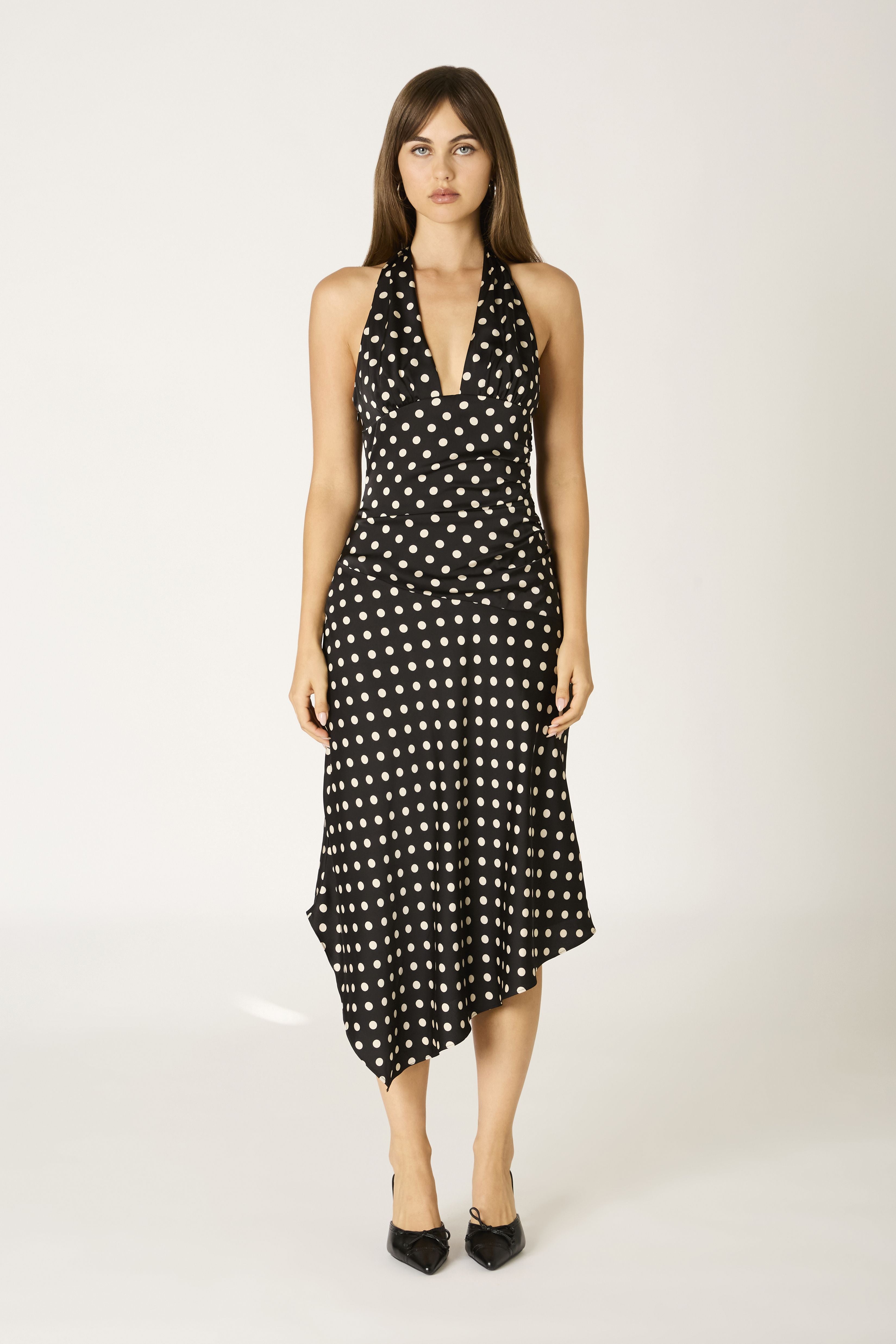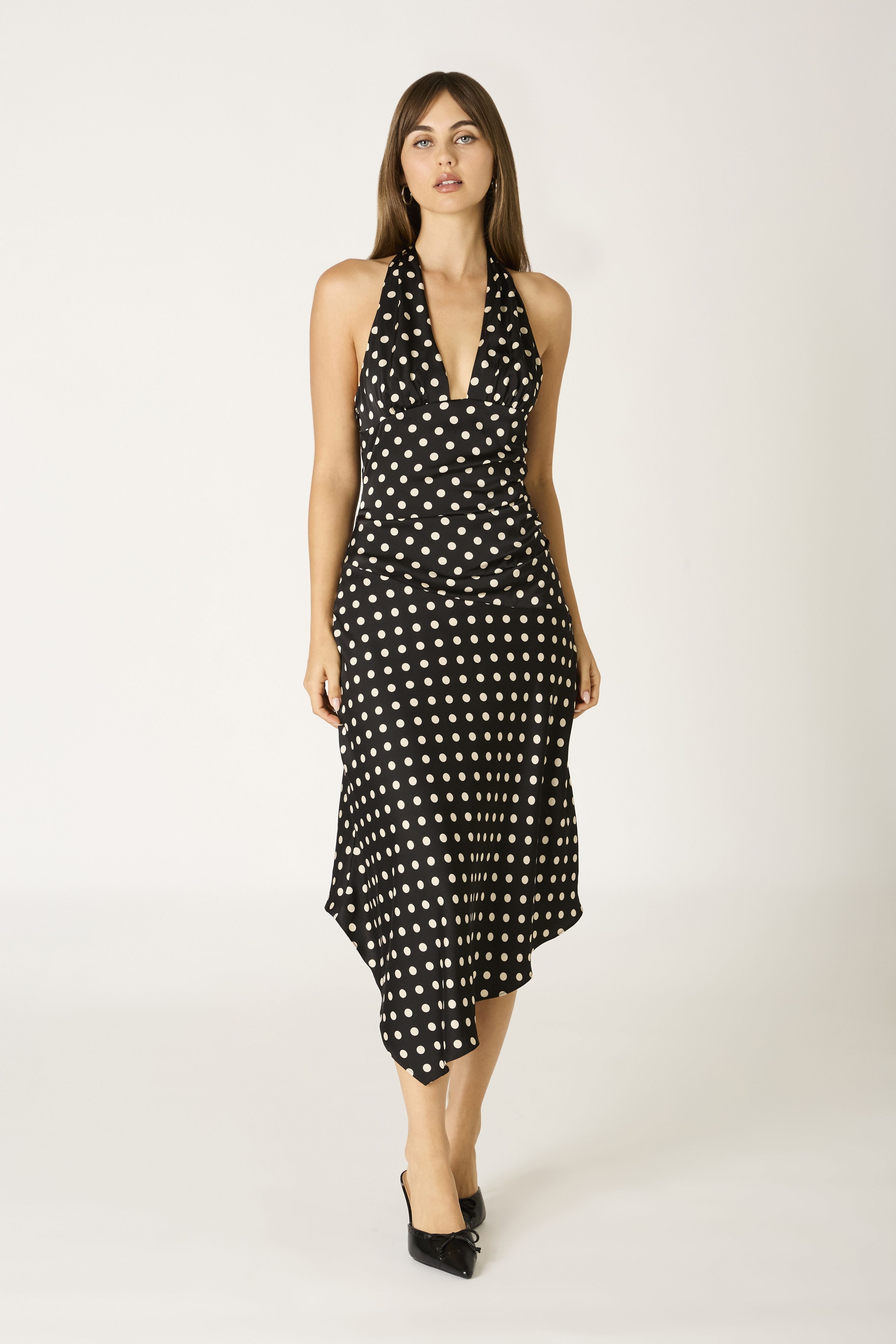 This satin halter midi dress features a polka dot print with a plunging neckline, tie-back detail, and an asymmetric hem.