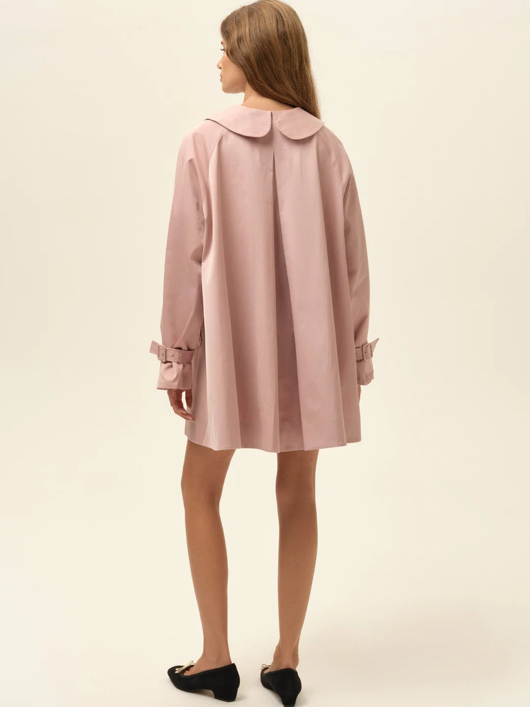 A '60s-reminiscent, mod-inspired dusty pink coat that will effortlessly elevate your outfits. Complete any spring outfit with this statement coat, perfectly finished with a Peter Pan Collar, oversized buttons, and a slightly flared hem.