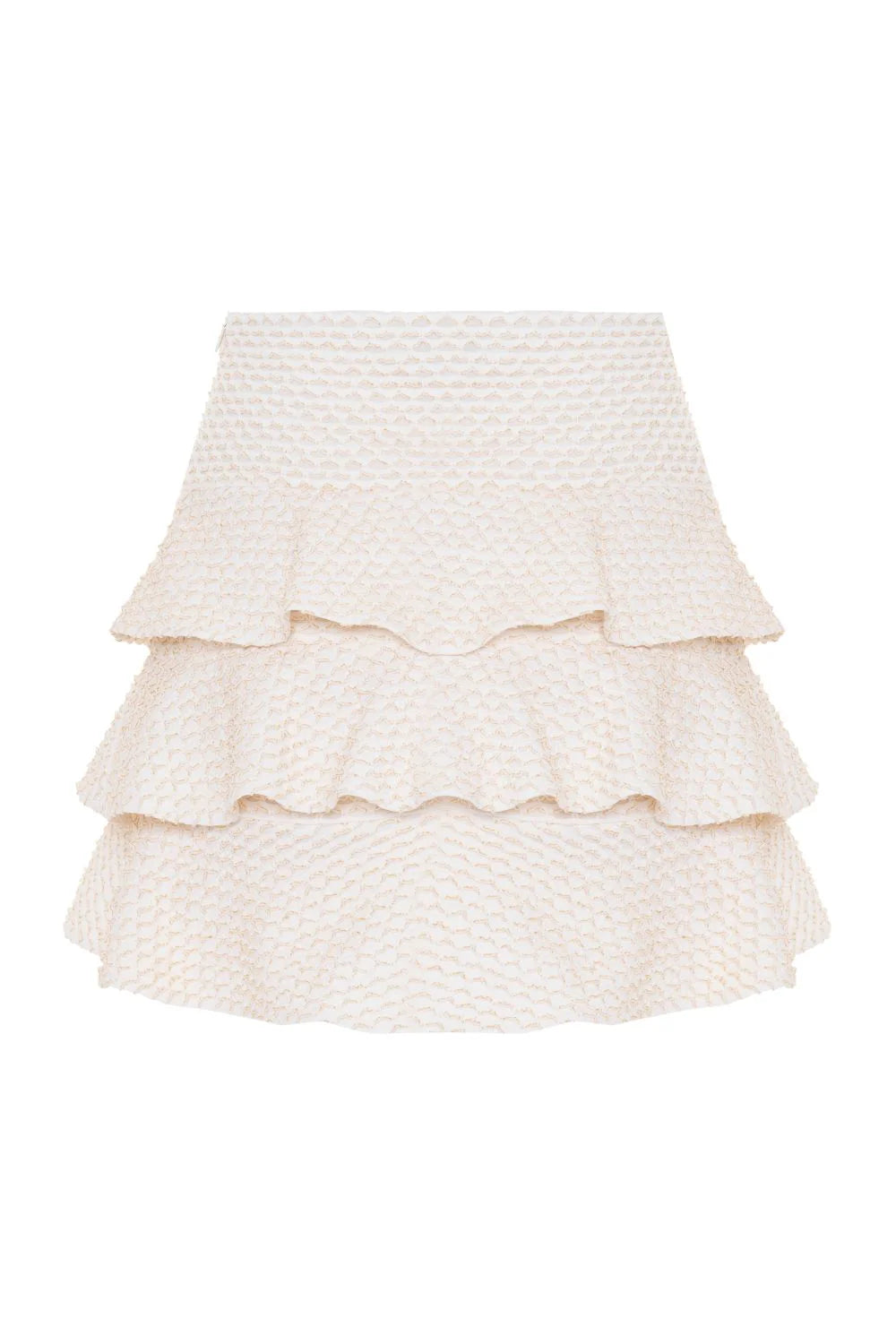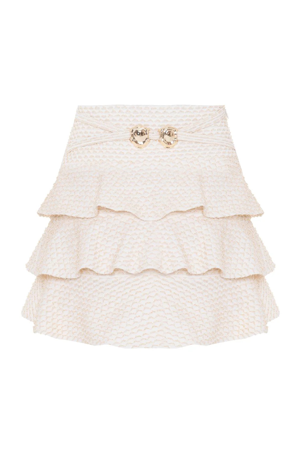 Flirty and feminine, the Gavea Mesh Mini Skirt features layered ruffles and a flattering high-waisted silhouette. The textured fabric and gold button accents add a touch of elegance, perfect for sunny days from Ipanema to rooftop soirées.