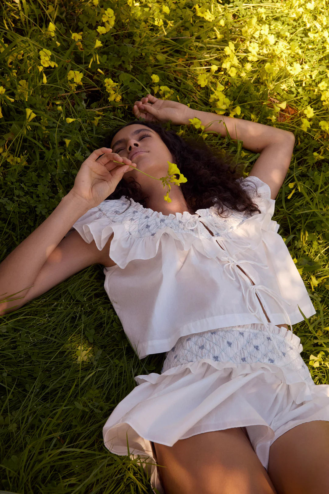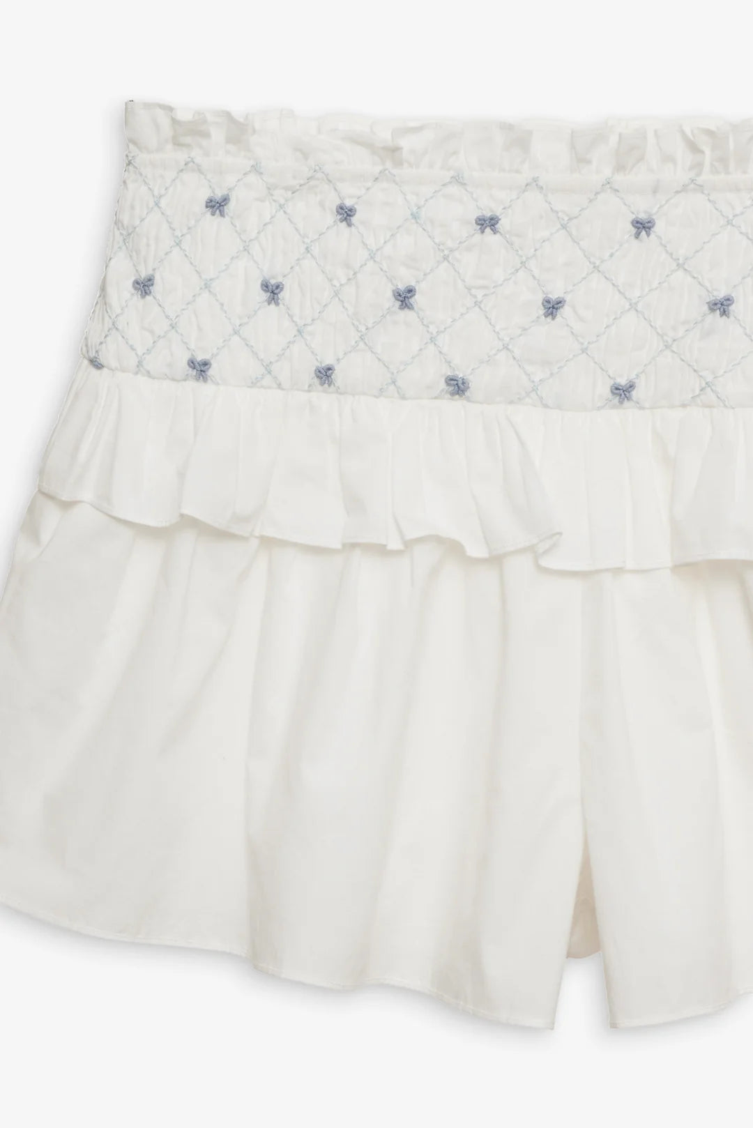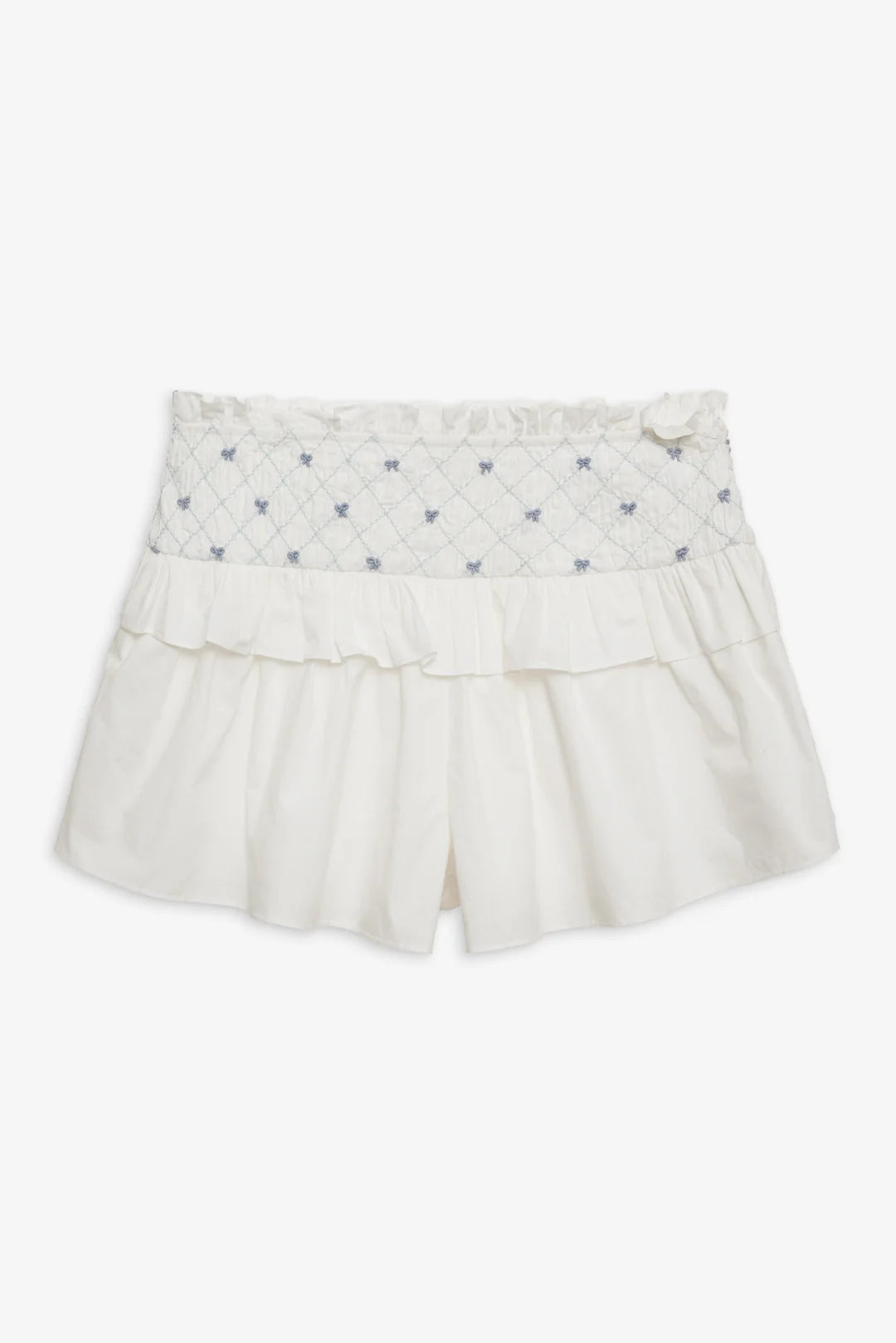 Made for barefoot walks, the Birdie Bow Smocked white ruffled shorts exude effortless beauty. Adorned with a dainty blue bow embroidered smocking at waistband, these white shorts fall at mid-waist and feature ruffle detals at the hip and wide leg opening.