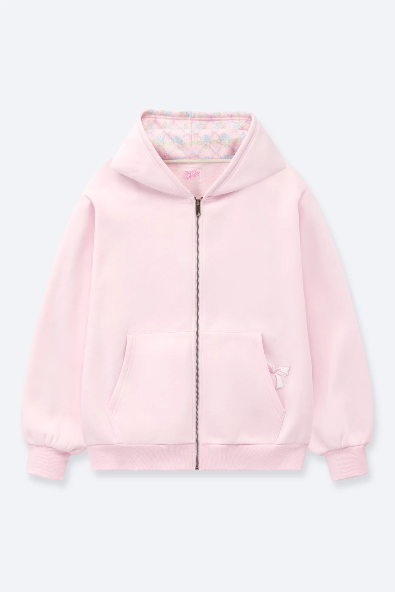 Wrap yourself in sweetness with the Ribboned Dreams Zip Hoodie — a cozy classic with a girly twist. This pale pink fleece zip-up features a pastel ribbon and floral-printed hood lining, delicate embroidered bow detail on the front pocket, and our signature Happy Camp3r puff logo across the back in bubblegum pink.