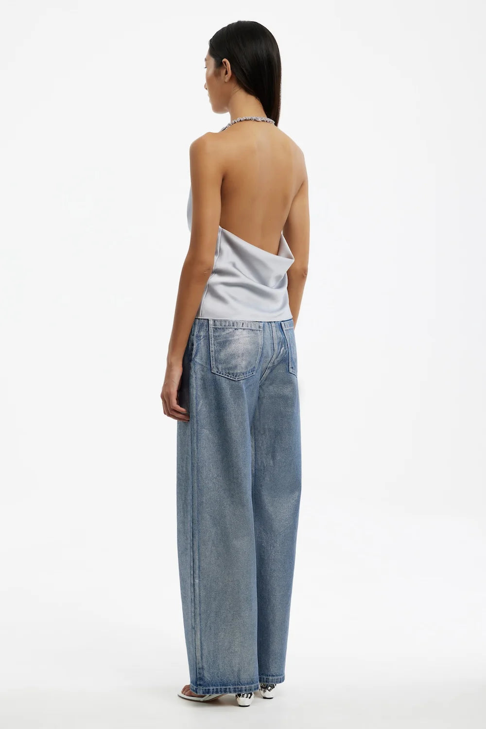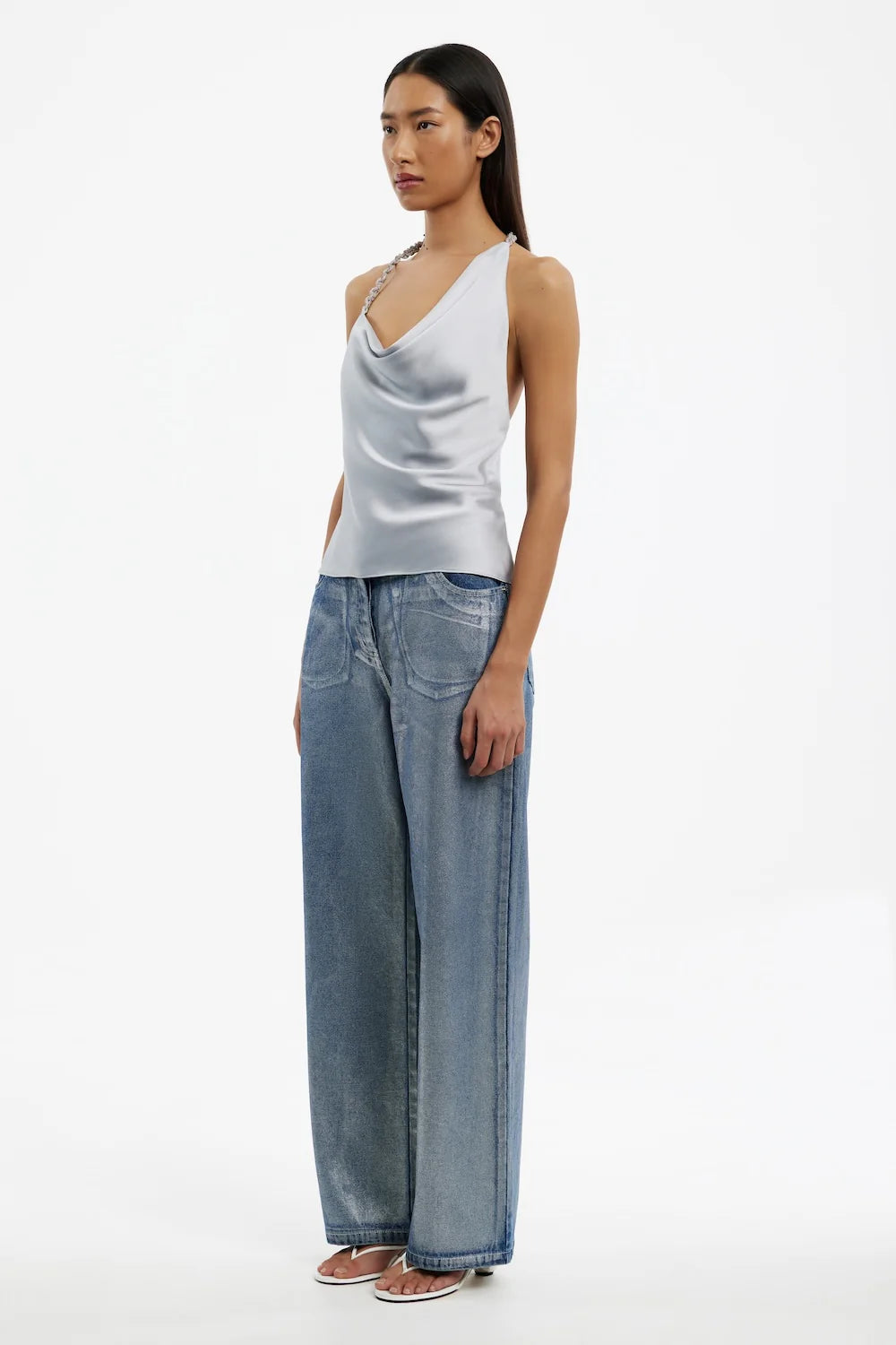 Sleek and striking, the Abbey Top in Pewter is crafted from fluid satin in a flattering bias cut. Featuring an asymmetrical cowl neckline with a braided metallic halter strap and a softly draped low back, this piece is perfect for polished evening styling.