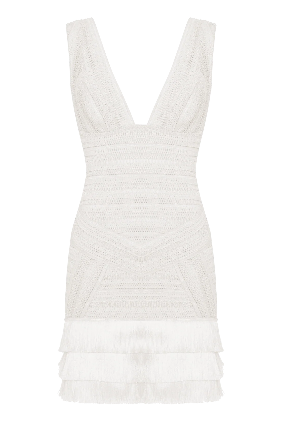 With a flattering V neckline, the Radiant Fringe Mini Dress is a true PatBO must-have. Crafted in an intricate crochet pattern, it features bold cut-outs at the waist and signature layered fringe detailing along the hemline, adding texture and movement to every step. A back zipper ensures a seamless fit.