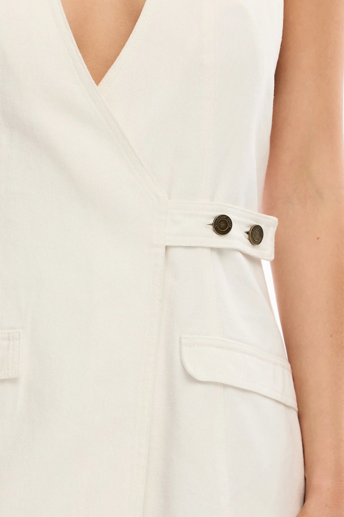The Micah Mini Dress in Ivory offers a modern take on structured denim. Designed with a true wrap closure and button detailing, this sleeveless mini dress creates a sleek yet effortless silhouette. Crafted from 100% cotton, it delivers a breathable feel while maintaining a structured fit. Perfect for both casual and elevated styling, the unlined construction ensures ease of movement and a lightweight finish.