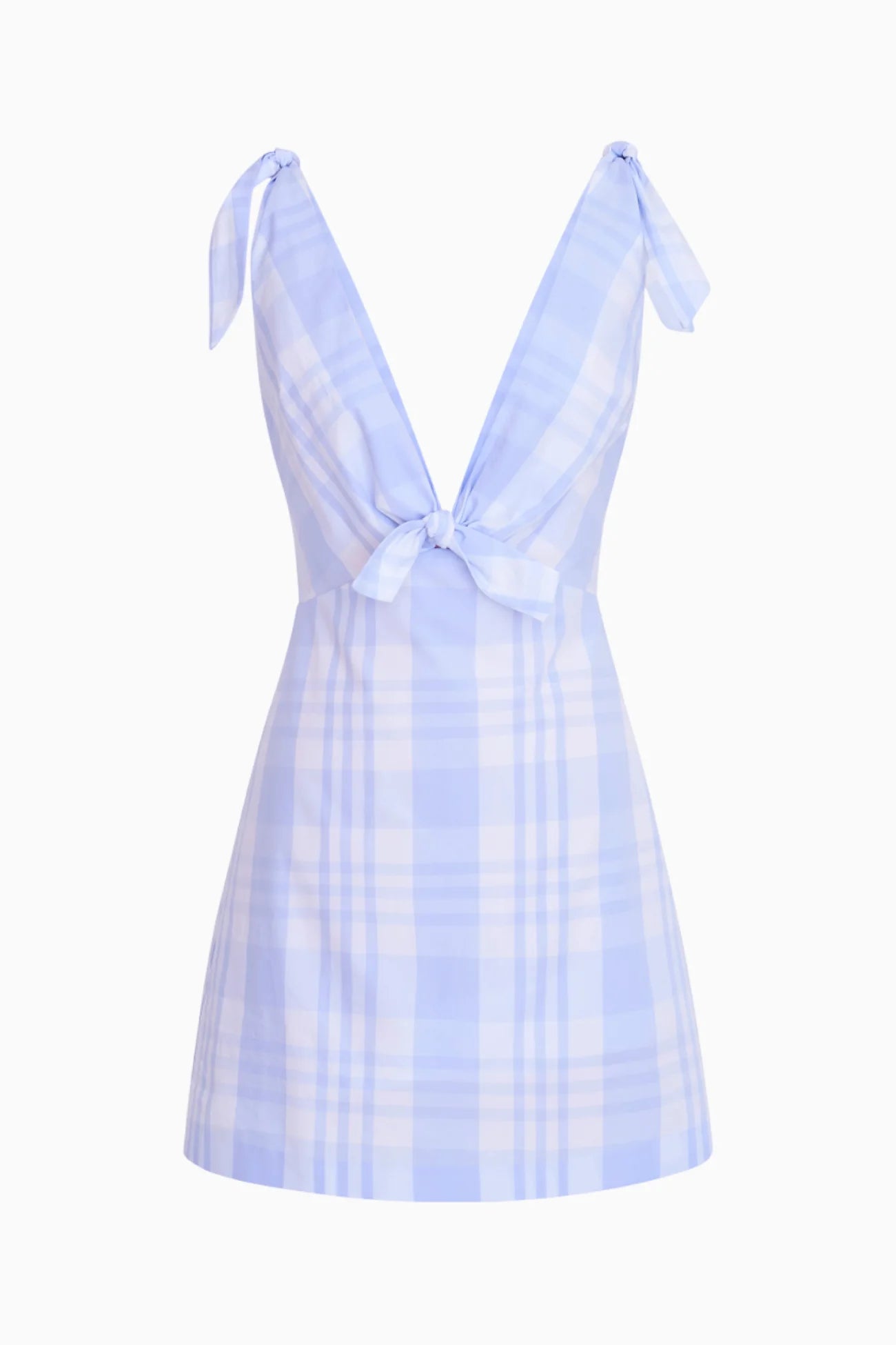 Forever charming in the Brynnie Dress. This pretty mini debuts with a crisp, cotton yarn-dyed fabric inspired by the construction of a scarf. The A-line mini features a scarf as a bodice that ties at the shoulders and the front. The piece is completed with a zipper.