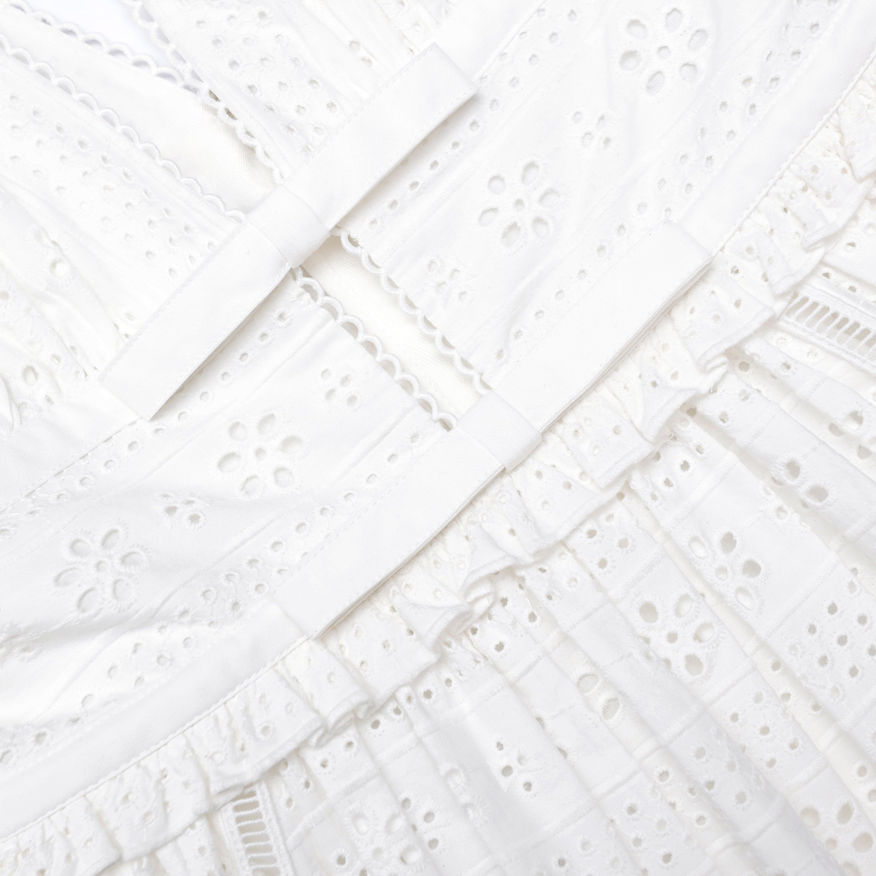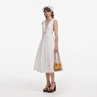 A plunging neckline adds sultry detail to this white cotton broderie midi dress. Topped with bows for some extra romance – style with strappy sandals to show off its full flared skirt.